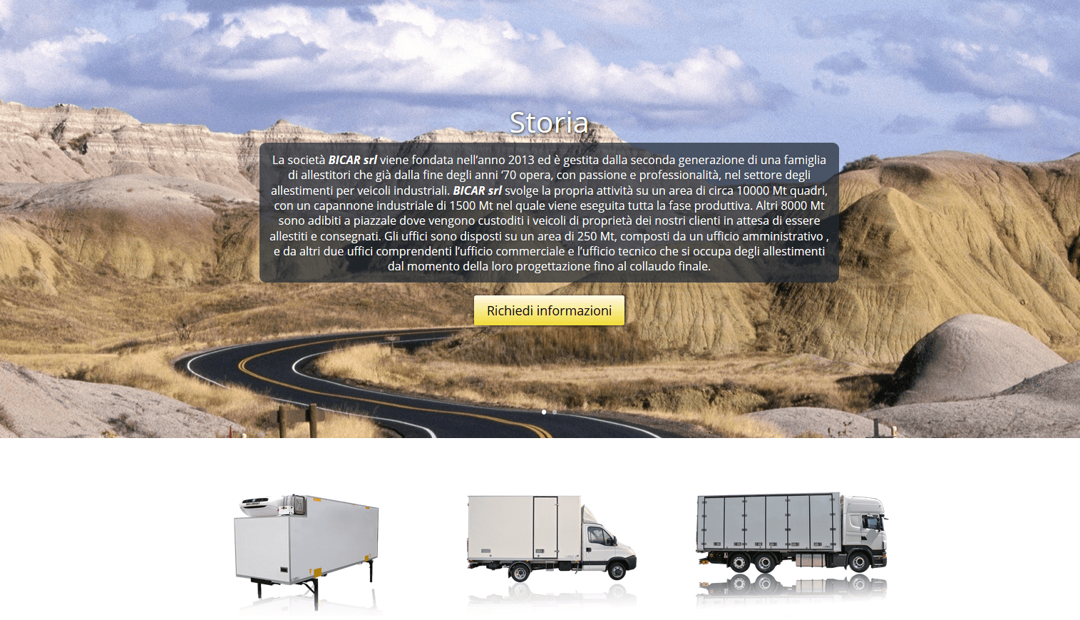 Il sito Bicar è nato per promuovere la passione e professionalità, nel settore degli allestimenti per veicoli industriali, di una famiglia di allestitori che opera da oltre 40 anni. Il tour virtuale Bicar Srl è nato per promuovere un’azienda che opera con passione e professionalità nel settore degli allestimenti per veicoli industriali che vuole proporsi come consulente altamente qualificato per ideare e concretizzare il tuo progetto di allestimento impiegando complementi di arredo resistenti e funzionali in termini di leggerezza resistenza e durevolezza. Bicar vuole essere un valido partner per ogni esigenza nell’allestimento interno ed esterno.